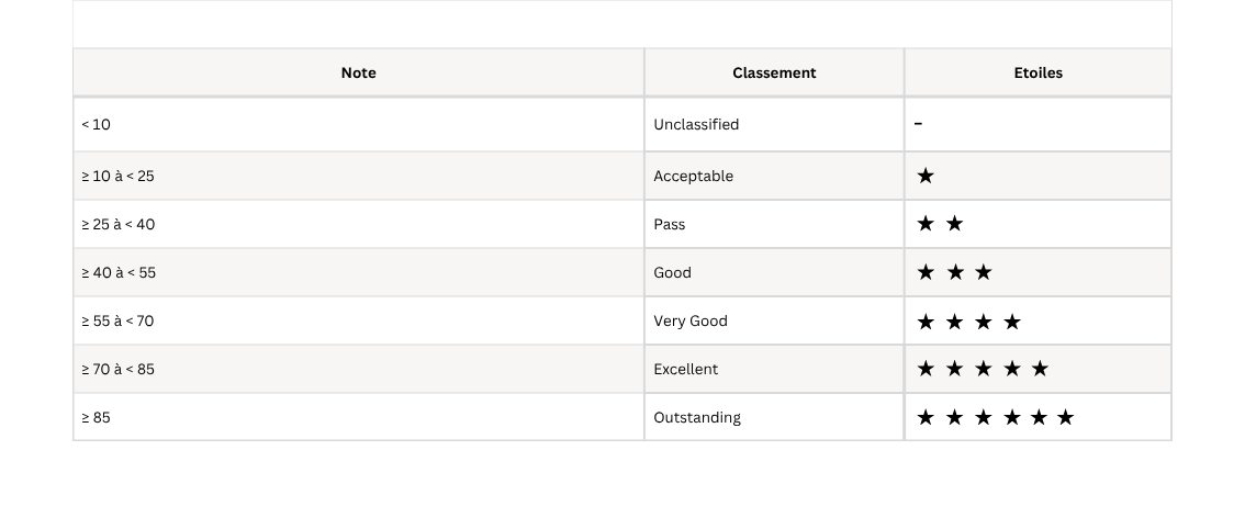 L’évaluation de la performance de chaque partie et de la performance globale du bâtiment se traduit par une note finale sur 100. Elle permet de classer l’actif certifié de « Acceptable » à « Outstanding », soit 1 à 6 étoiles.