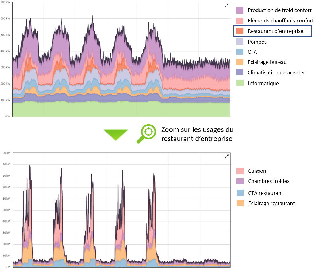 Ces usages spécifiques ont des fonctionnements, des contraintes et des leviers d’optimisation différents et bien segmenter leurs consommations permet de mieux évaluer et suivre les économies d’énergie propres à chaque usage. Ainsi, l’observation du profil de consommation du restaurant permet d’observer des pics de puissance liés au démarrage des équipements de cuisson.