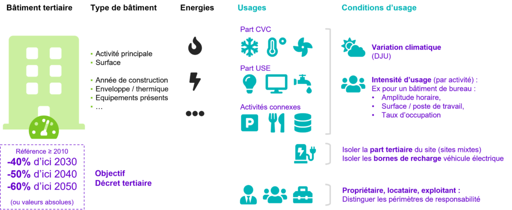 Pour les usages CVC, les conditions d’usage sont les variations climatiques, qui se basent sur l’indicateur des DJU (Degrés Jours Unifiés) dans le Décret Tertiaire.