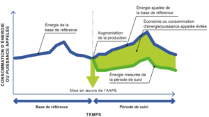 L’idée est de partir d’une situation de référence avant la mise en place de la démarche d’efficacité énergétique. Ensuite il s’agit de définir des facteurs influents (ce que l’on appelait tout à l’heure les conditions d’usage) pour estimer l’évolution de la consommation en fonction de ces facteurs influents.